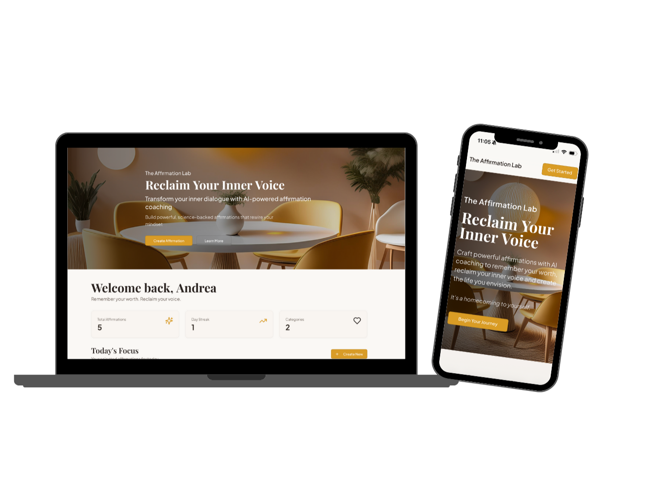 The Affirmation Lab digital app helps you craft personalized affirmations specific to your life with AI coaching built-in. By reframing your thoughts into positive, present-tense statements, you reclaim the inner voice that shapes and cultivates a vision for your life.